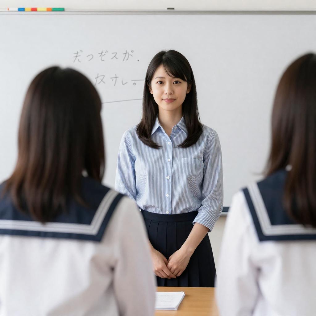 Photograph of an Asian woman with long black hair, wearing a blue and white striped shirt, standing in front of a whiteboard with Japanese . Two other Asian women with black and white sailor-style school uniforms, seen from behind, face her. Bright classroom setting with a whiteboard and colorful markers on the left.