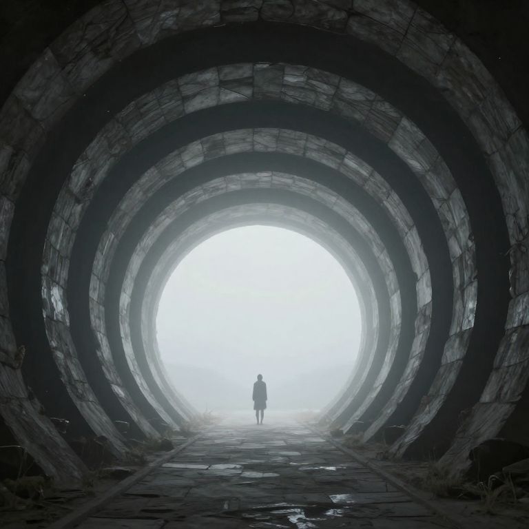 A desolate, otherworldly pathway winds through massive, concentric stone arches, leading toward a distant figure standing before a luminous, fog-shrouded horizon where reality seems to dissolve into the infinite.