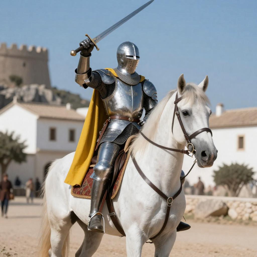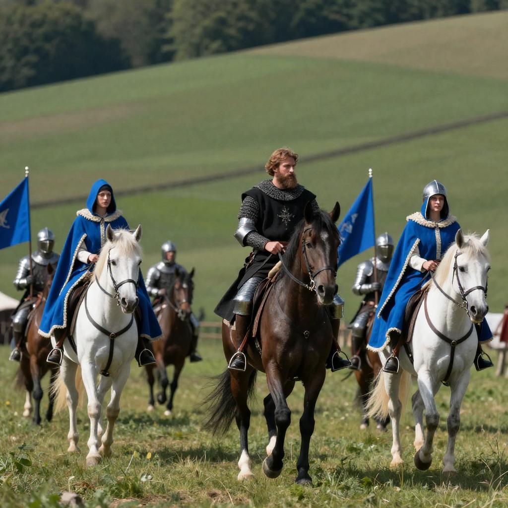 Photograph of a medieval reenactment scene. Knights in armor on horseback, with one white horse and one red horse, lead a group of soldiers holding colorful flags. The background features a stone wall and rows of soldiers with spears. Bright sunlight casts shadows on the sandy ground.