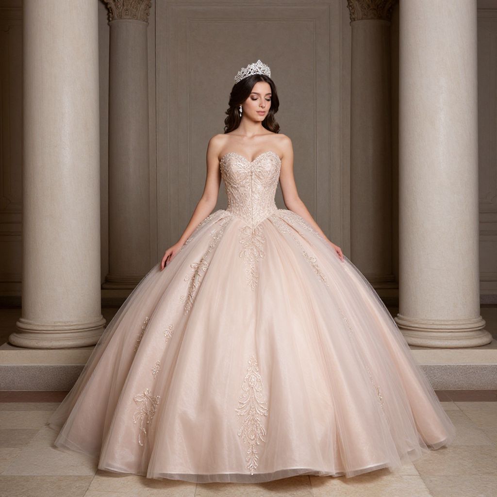 Elegant young woman wearing a strapless, blush-pink quinceañera gown with intricate beadwork and a voluminous tulle skirt, accessorized with a sparkling tiara, stands gracefully between two ornate columns in a grand, classical interior setting.