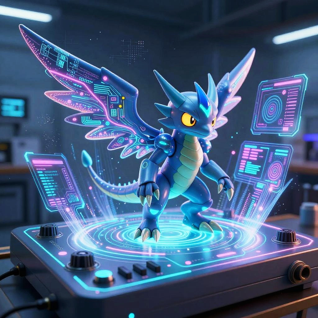 Digimon generator concept art, futuristic digital creature synthesizer, glowing neon interface with swirling data streams, intricate circuit patterns and holographic screens, vibrant cyberpunk color palette, tech laboratory backdrop, high detail