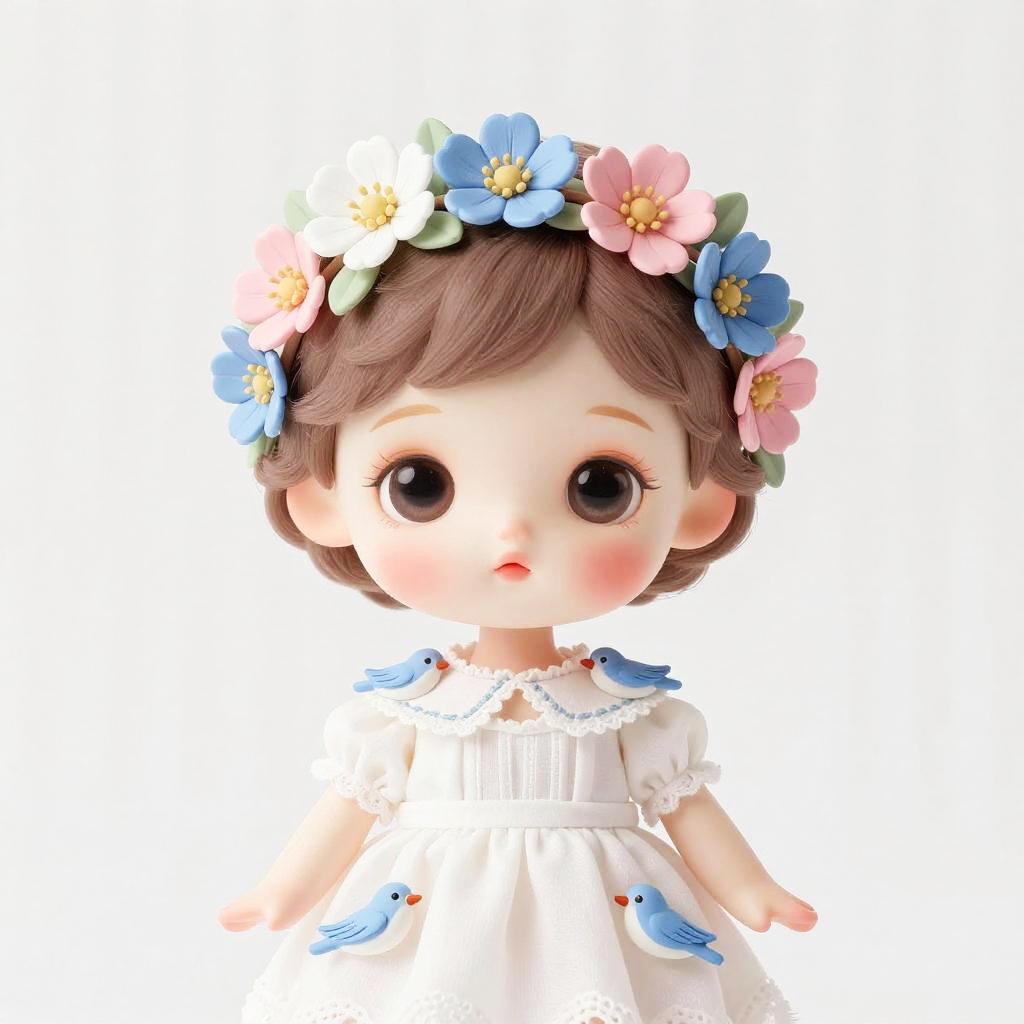 This is a digital artwork of a cute, porcelain-skinned doll with big, brown eyes and a soft, rosy blush. She has a white floral crown with pink and blue flowers, and wears a white, ruffled dress with blue bird accents on her collar and crown. The background is a simple white vertical stripe, making her the focal point. The style is whimsical and delicate, with a soft, almost pastel color palette.