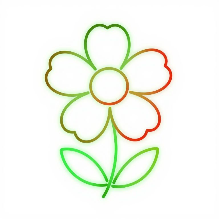 A simple 2D line drawing of a flower glowing with green and red neon colors. The flower features five heart-shaped petals and two leaves on a white background, creating a clean and minimalistic design.