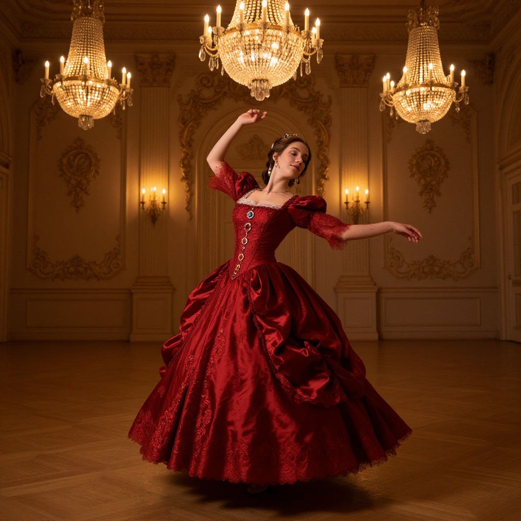 Lexie in an elegant Victorian-era ballroom, wearing a lavish crimson gown adorned with lace and jewels, gracefully dancing under crystal chandeliers, soft candlelight casting warm shadows, intricate background with opulent decor.