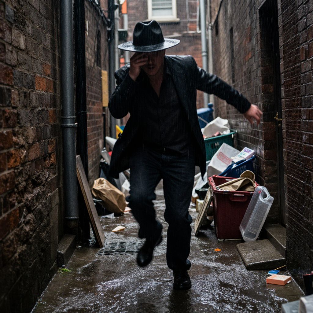 Stalky man captured mid-motion in a narrow, cluttered backstreet, rain dripping from a wide-brimmed hat, shadowed face partially visible, gritty urban realism, detailed textures on brick walls and wet pavement, suspenseful mood