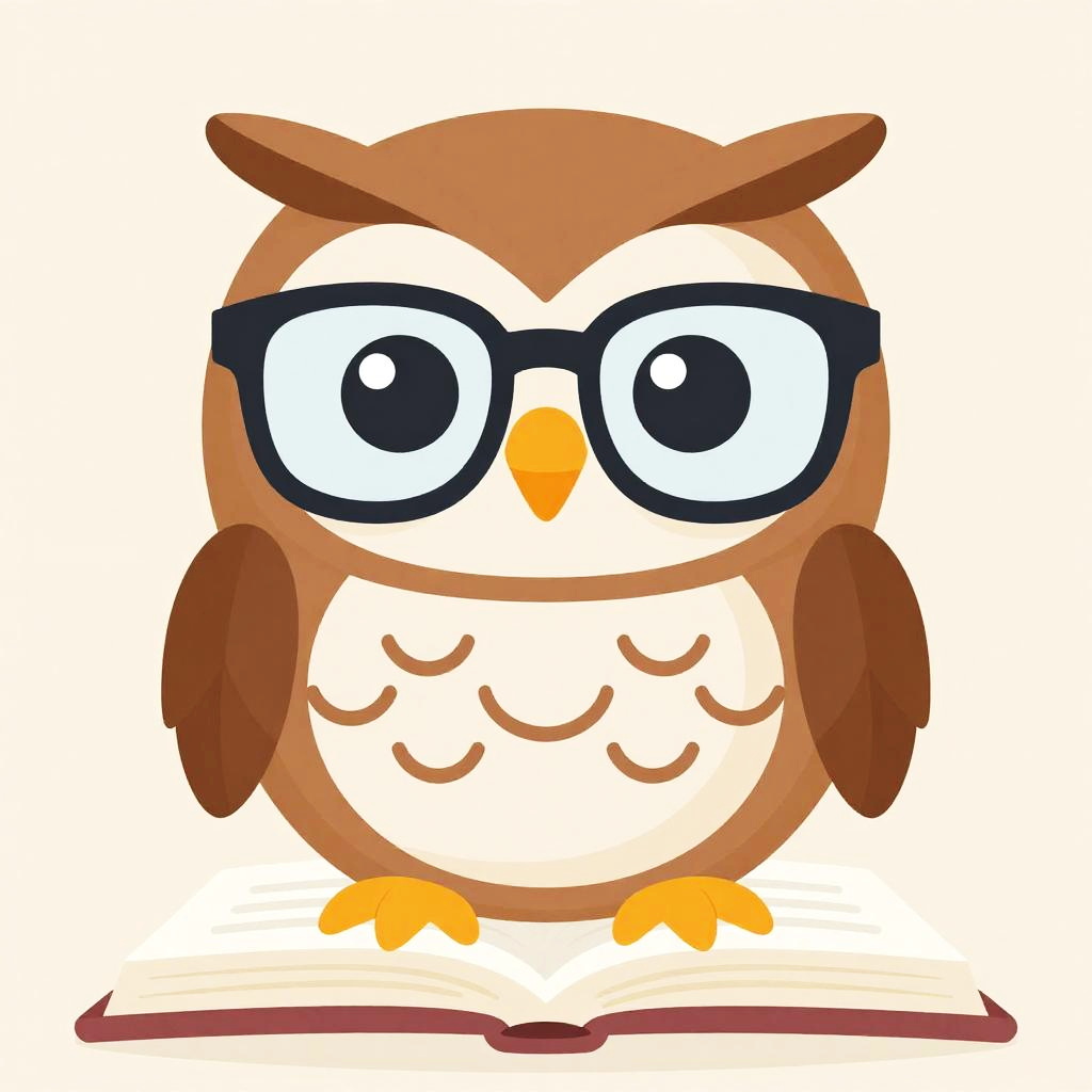 Cartoon owl with orange body, white belly, large round glasses, and big smile, waving in a moonlit library with scattered books. Bright,