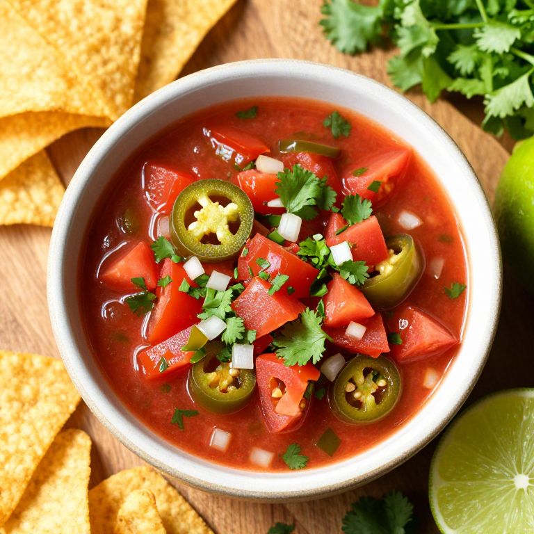 Jalapeno infused gourmet salsa in a rustic bowl, with visible chunks of jalapeno, tomatoes, onions, cilantro, and lime, bright and fresh colors, top view, natural sunlight, styled with tortilla chips and fresh ingredients on wooden surface.
