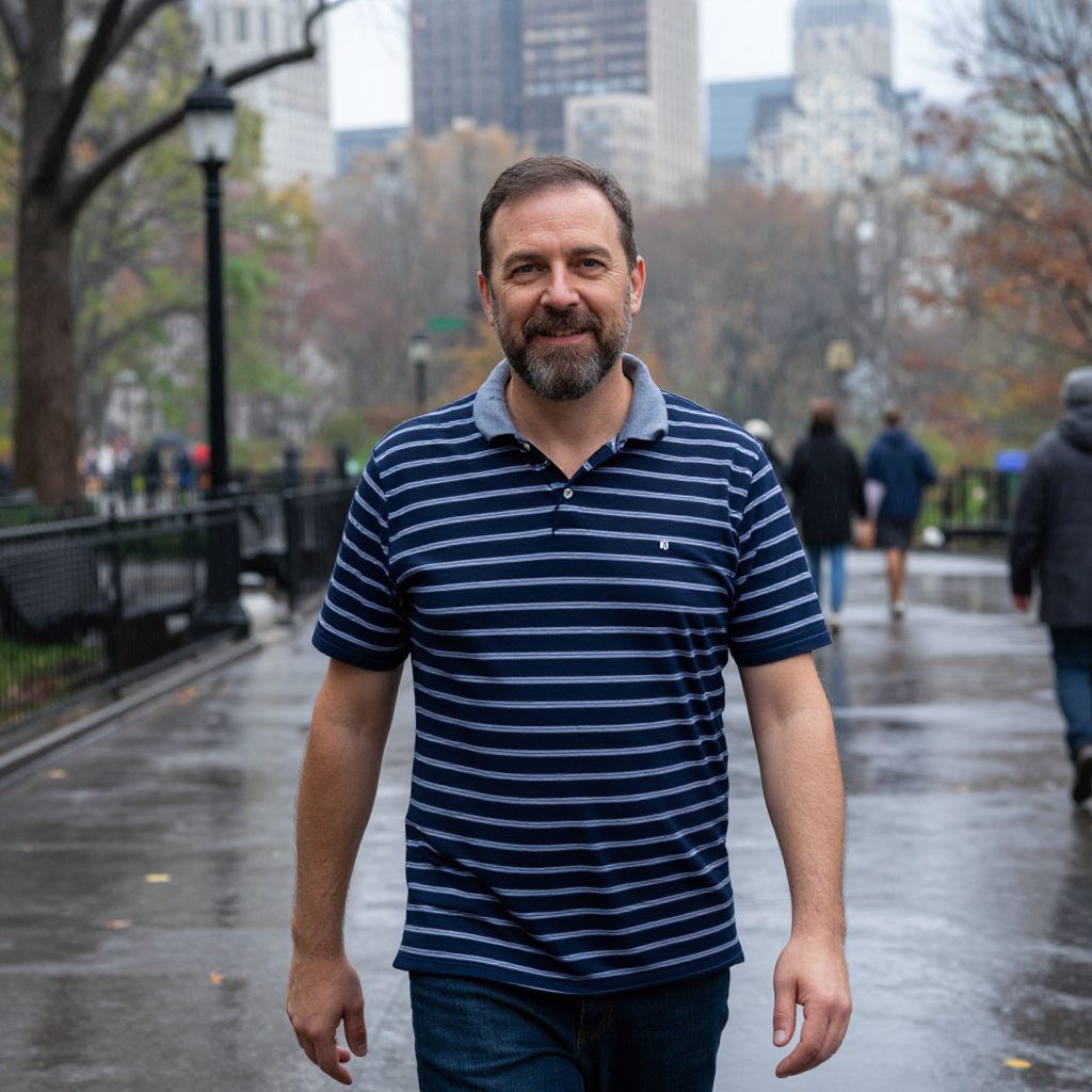 A close-up portrait of a middle-aged man with a friendly, weathered face and gray beard wearing a classic glen plaid shirt, sitting on a wooden porch in the early autumn afternoon, with golden sunlight filtering through the trees and leaves rustling in the breeze.