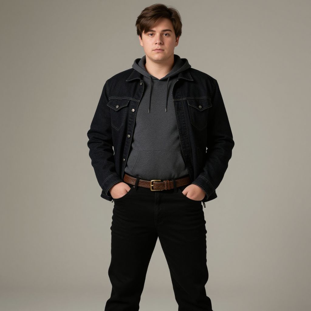 Photograph of a young Caucasian man standing against a plain gray background. He has short, dark brown hair and a serious expression. He wears a black denim jacket over a dark gray hoodie, black jeans with a brown leather belt, and has his hands in his pockets. The lighting is even, highlighting the textures of his clothing. His casual, slightly rugged style contrasts with the simple, uncluttered background. The image is sharply focused, emphasizing the details of his outfit and facial features.