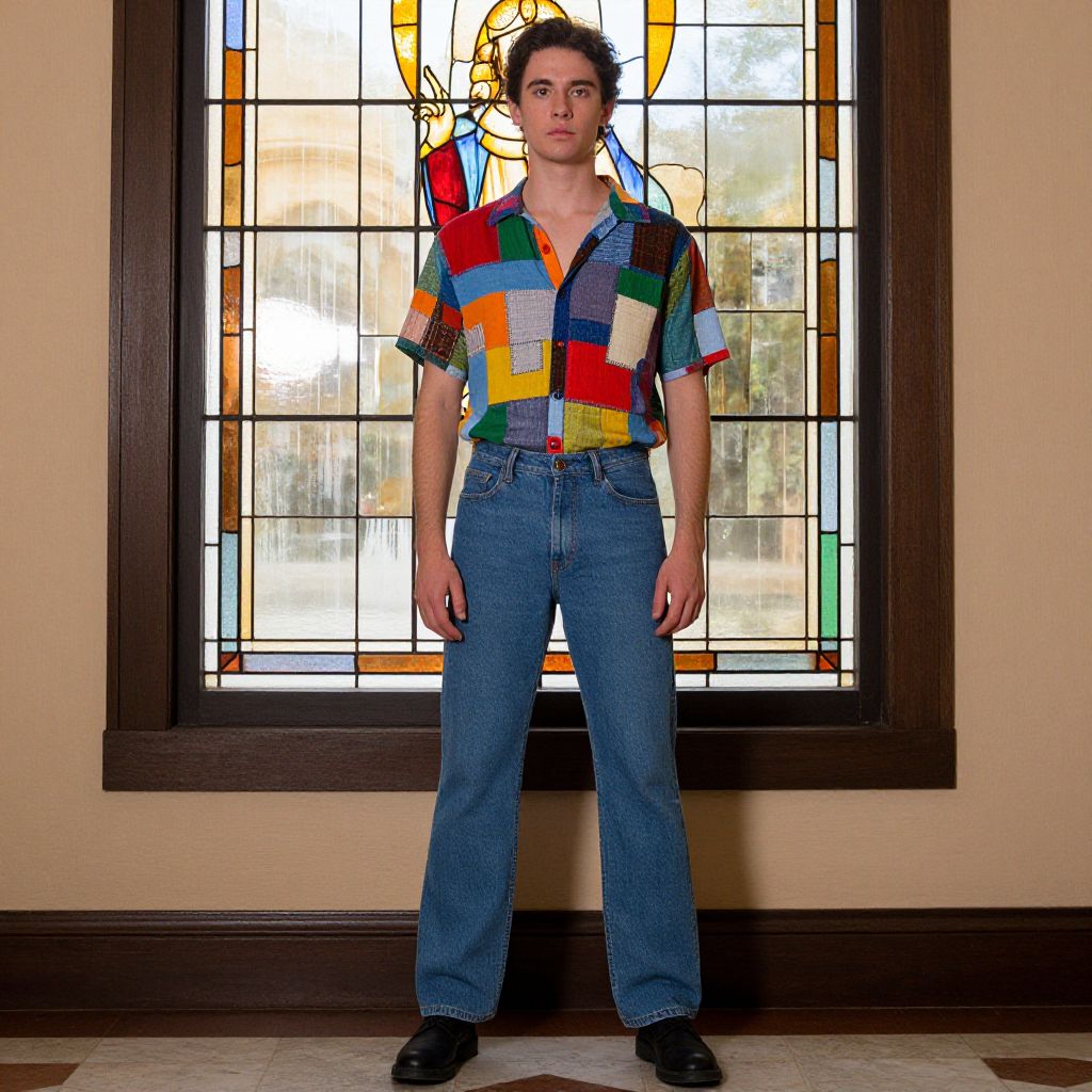 Photograph of a young man standing in front of a large, ornate stained glass window. He has short, dark hair and a fair complexion. He wears a colorful, patchwork short-sleeve shirt with a mix of bright red, yellow, green, blue, and white squares, and blue, flared jeans with a high waist. His black shoes are slightly scuffed. The stained glass window behind him features intricate, geometric patterns with a mix of yellow, orange, and blue colors. The beige wall and dark wooden trim frame the window, and the floor is light-colored tile. The man stands with a neutral expression, arms relaxed at his sides.