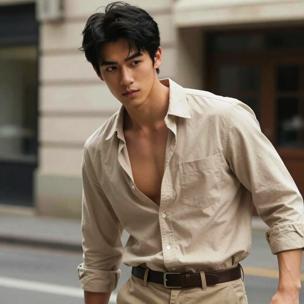 Realistic, masterpiece, best quality, cinematic lighting, natural shadow, highest detail, professional photography, detailed background, depth of field, insane details, intricate, aesthetic, detailed face, subsurface scattering, realistic hair, realistic eyes, muscular, masculine, large pectorals, photo of a handsome asian man, (20 year old), black hair, beige-color, open clothes, shirt, belt, pants, cuffs, dynamic pose, outdoor, city street