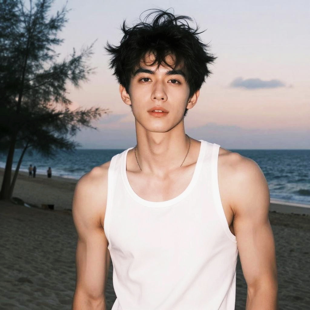 Photograph of a handsome young man with dark hair, light skin, wearing an unbuttoned beige shirt, and beige pants, standing on a street