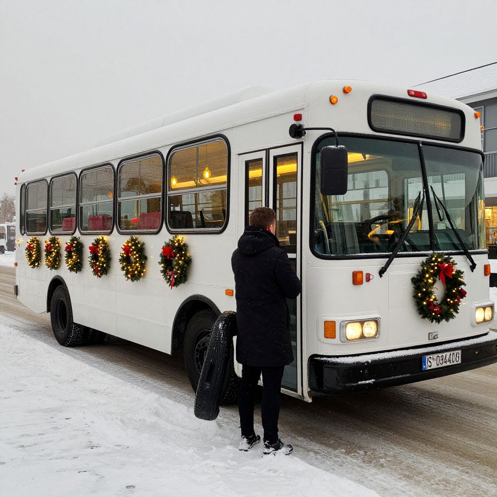 Photograph of a white bus decorated with Christmas lights and wreaths, parked on a snowy street. A man with short brown hair, wearing a black coat and black pants, stands in front of the bus, holding a black tire. The bus's windows are lit from the inside, and the sky is overcast. The scene has a festive, wintry feel.