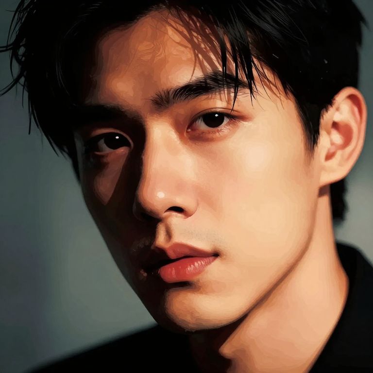 Photorealistic digital portrait of a young Asian man with short black hair, wearing a red button-up shirt, against a black background, with a contempl