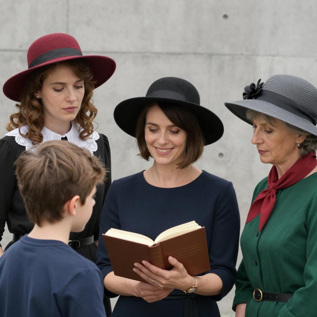 Seven people walking on a dirt path through green fields, led by a central woman wearing a black graduation gown and cap holding a diploma. Surrounding her are six adults, including four women dressed in dark and red dresses with different styled hats, and two men wearing suits. The group is walking in a line down a rural trail bordered by grass.