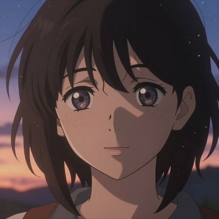 Anime character face showing subtle smile, gentle eyes shimmering with depth, delicate freckles across the nose, framed by loose loose locks of hair, set against a twilight sky filled with soft glowing stars and a calming gradient