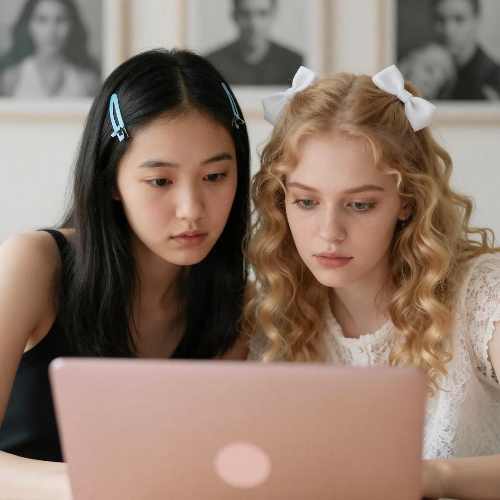 Photograph of two women in a classroom. Blonde woman in beige blazer and white shirt, holding a map, looking at it. Dark-haired woman in light blue shirt, holding the map, looking at it. Green wall map in background. Both women standing, interacting with map. Mug in blonde woman's left hand. Classroom setting with maps and posters. Blonde woman's expression is focused, dark-haired woman's expression is neutral. Both women standing close together.