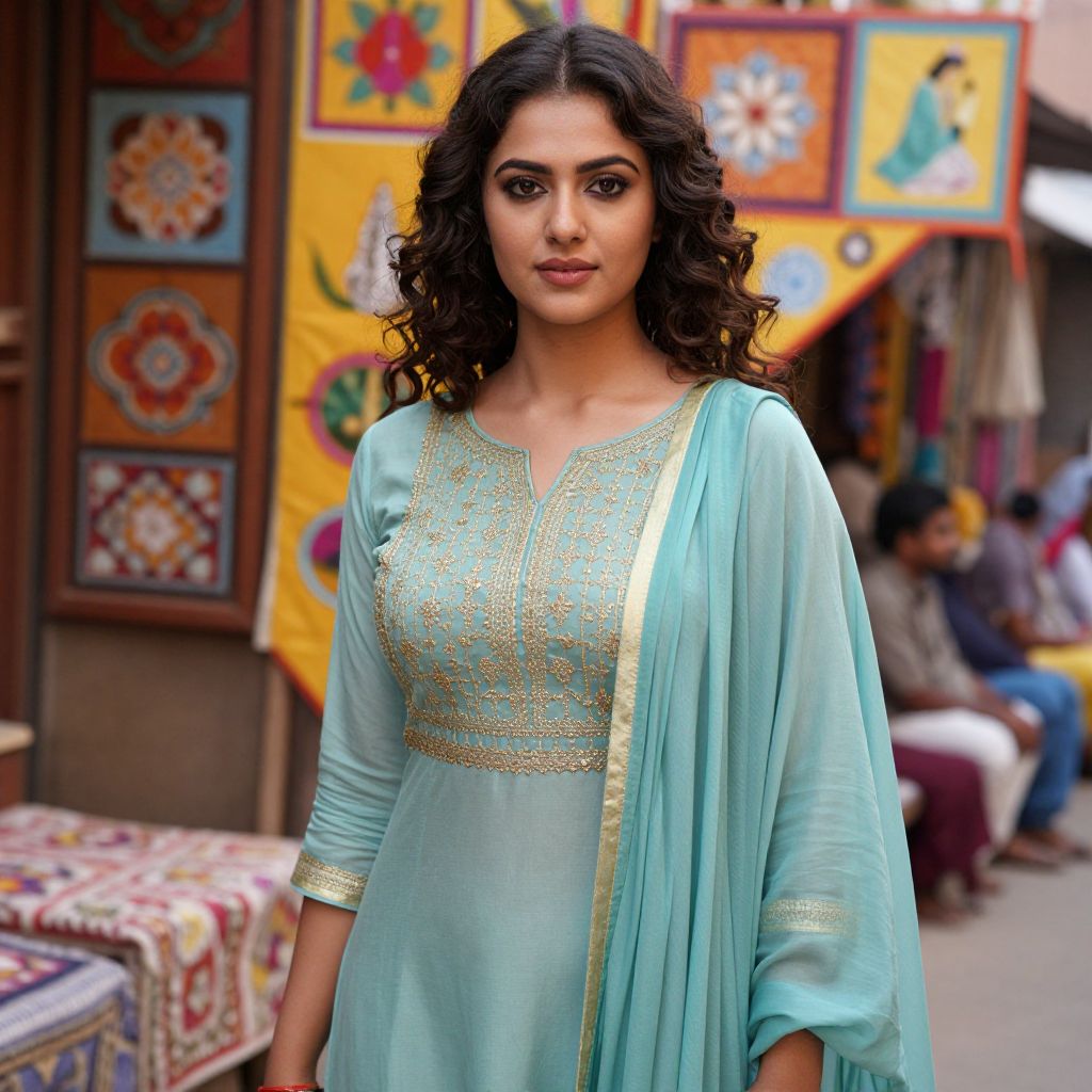 Photograph of a beautiful South Asian woman with dark curly hair, wearing a light blue, gold-embroidered traditional kurti, standing in