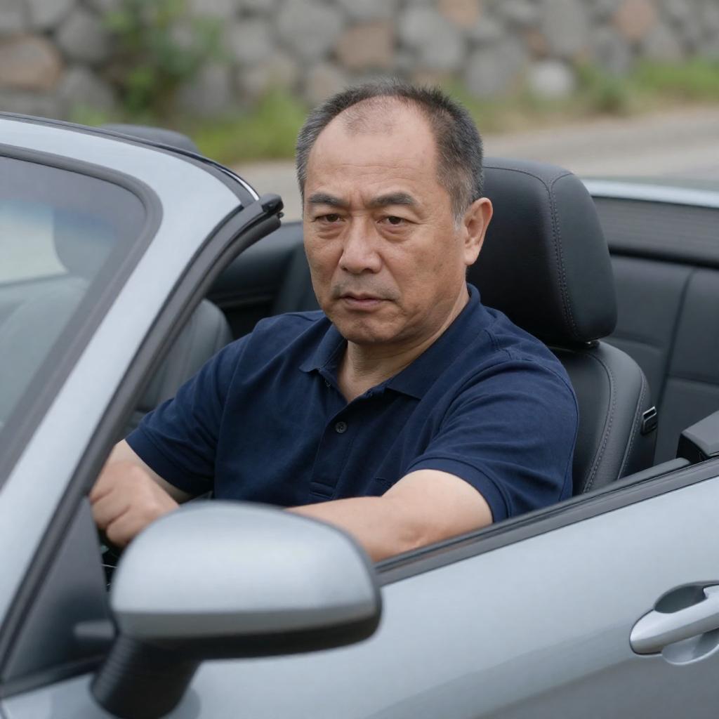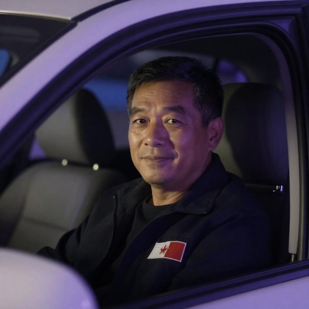 Photograph of a middle-aged man with short, dark hair and a slight smile, sitting in a car. He wears a dark jacket with a white and red patch on the left side. The car window is open, and the background is blurred with blue and purple lights. The man's face is illuminated by the car's interior light.