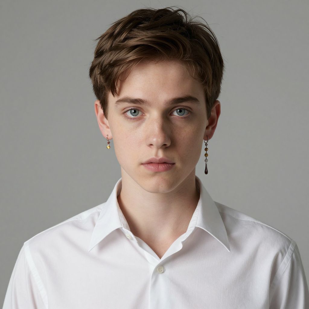 Photograph of a young Caucasian man with short, dark brown hair and blue eyes, staring directly at the camera with a neutral expression. He wears a crisp, white button-down shirt and small, gold earrings with black and white accents in his left ear. The background is plain and light grey, providing a simple contrast to the subject's white shirt. The image has a realistic, portrait-style appearance with sharp details and even lighting.