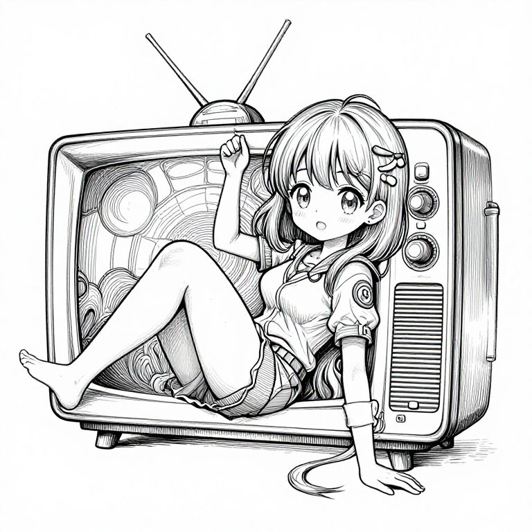 A detailed line drawing of an anthropomorphic television, styled as a beautiful and cute anime girl, with intricate details and a surrealistic, dynamic pose, set against a white background.