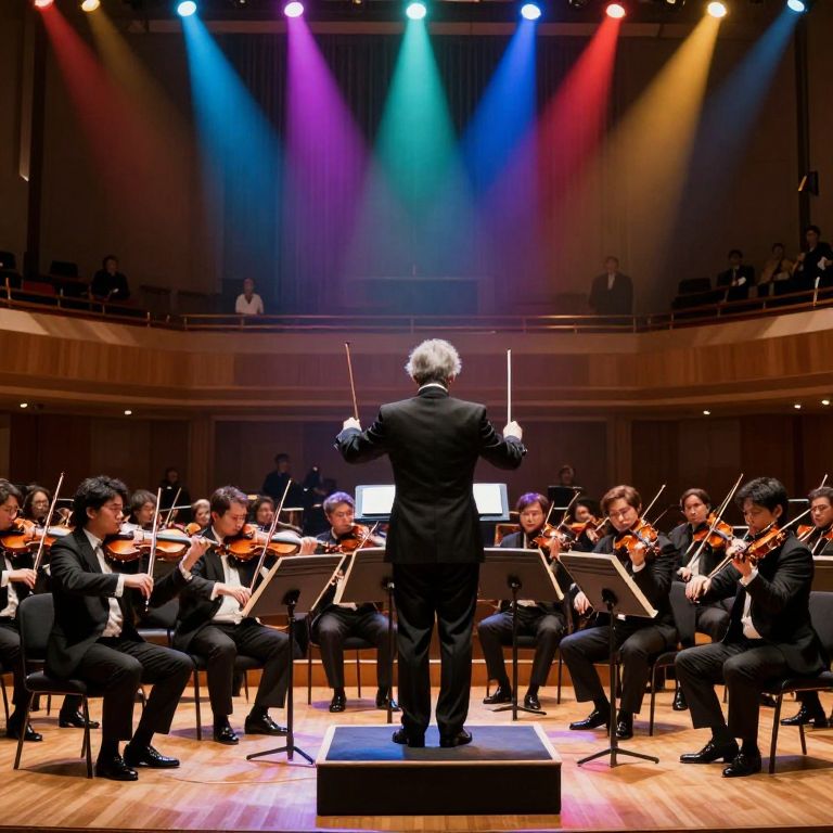 Symphony musicians in formal attire sit in rows, bowing their violins under vibrant beams of colored stage lights, while a central conductor stands illuminated atop a circular platform, orchestrating a mesmerizing blend of light and sound in a grand concert hall.