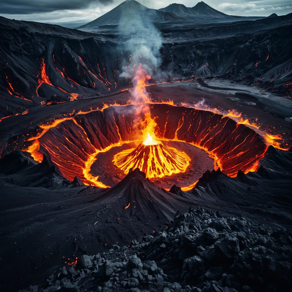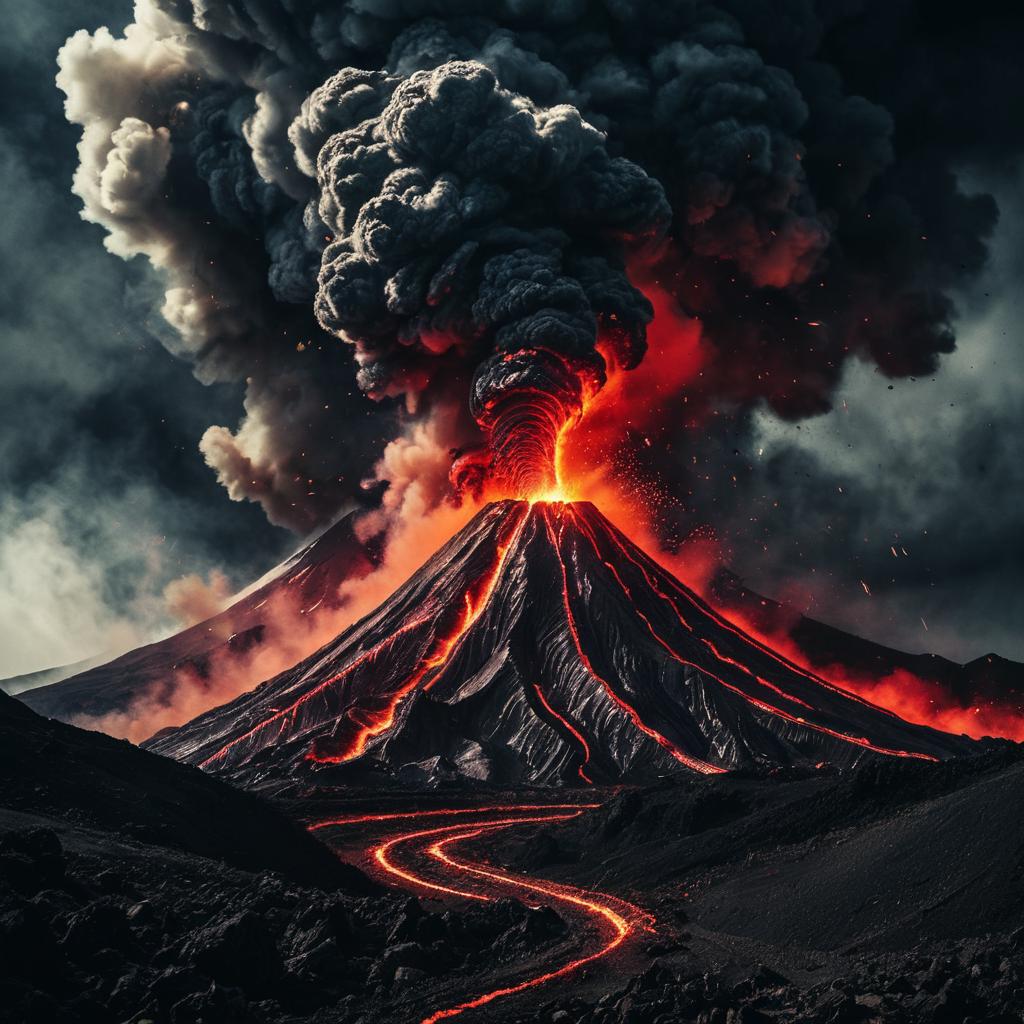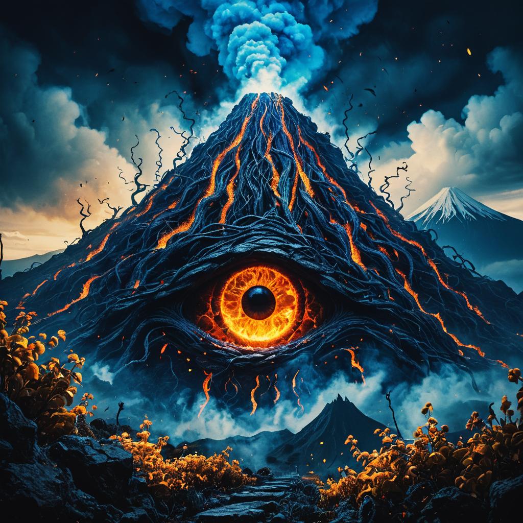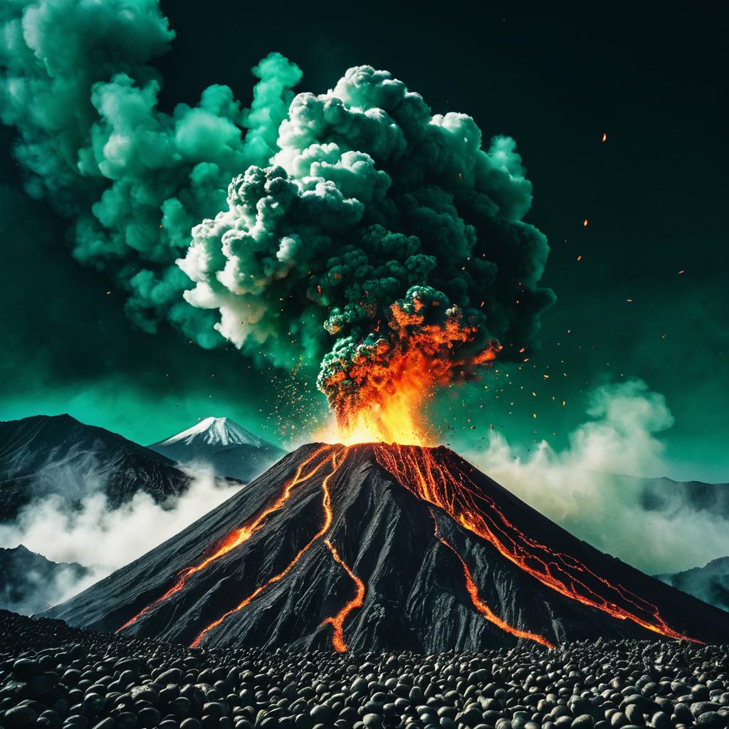 A surreal volcano constructed from bronze plates and scarlet glass erupting molten lava with dramatic lighting. The volcanic smoke forms the shape of a twisting serpent, creating a fantasy landscape inspired by H.R. Giger's style. The scene features glowing lava streams flowing down the volcano, dark rocky terrain, and thick, textured smoke clouds.