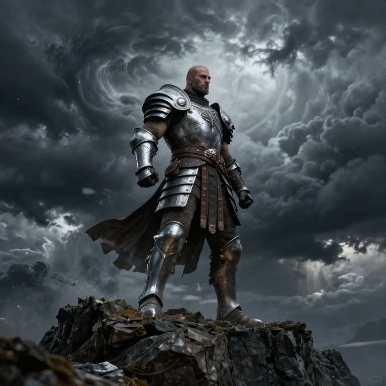 Photorealistic digital art of a bald, muscular man in silver armor standing on a rocky cliff, under a dramatic, cloudy sky.