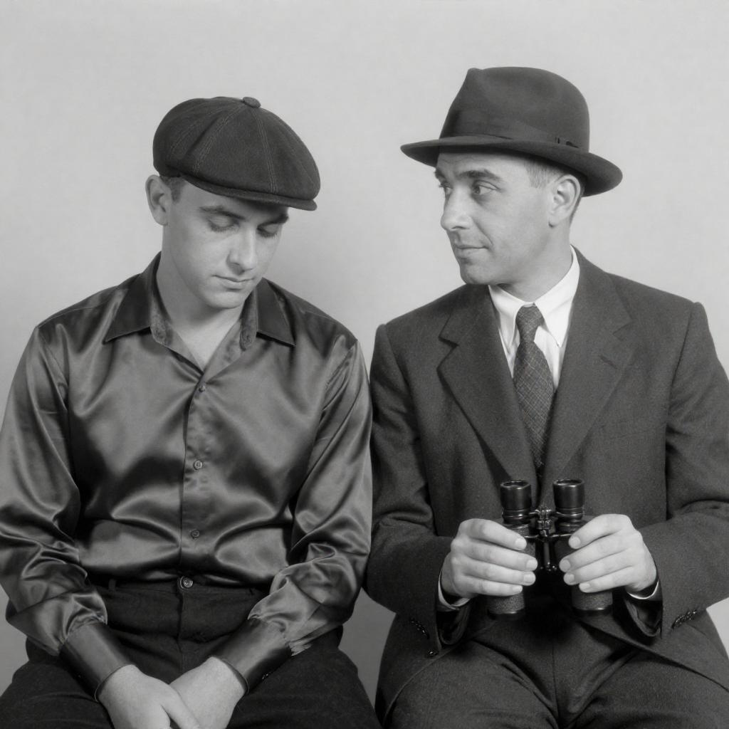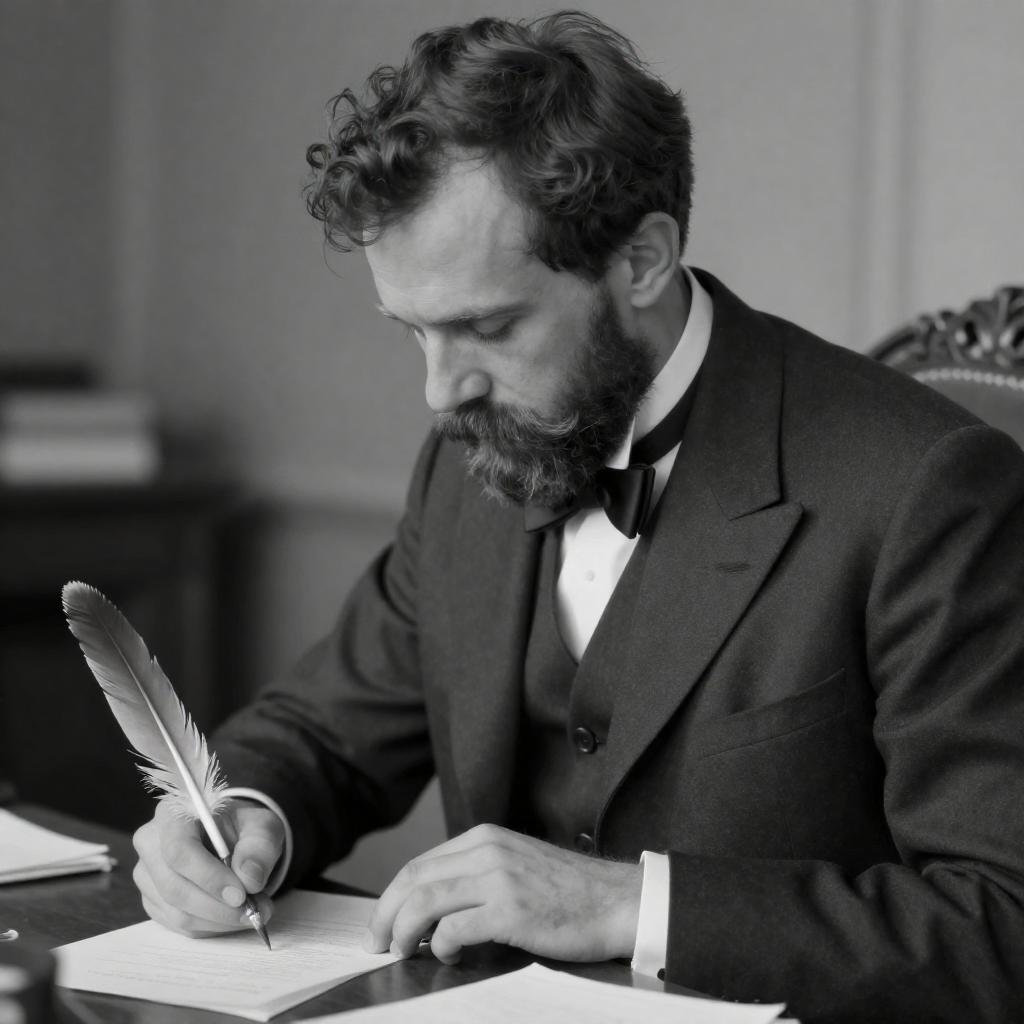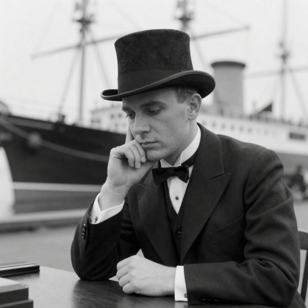 Black-and-white photograph of a man in a dark suit, white shirt, and black bow tie, sitting at a desk, wearing a black top hat. He rests his chin on his hand, looking down thoughtfully. Large ship in the background, anchored with visible masts and flags. Man's expression is serious and contemplative.