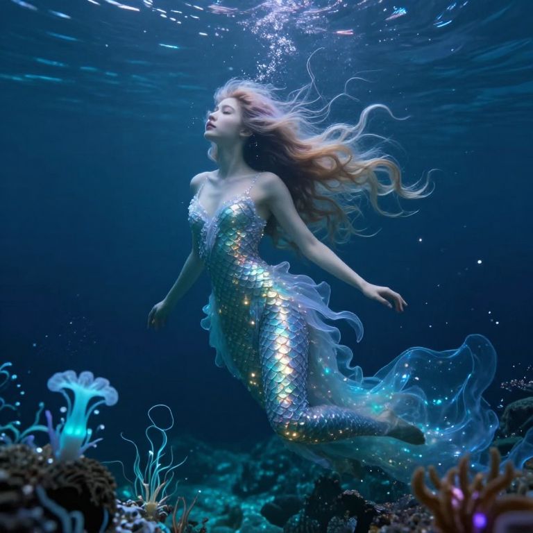 An enchanting portrait of an aquatic enchantress emerges from the depths, her iridescent scales shimmering like starlight and flowing hair resembling seaweed tendrils. This ethereal creature rises through an underwater realm, illuminated by bioluminescent flora, evoking a sense of wonder as she bridges terrestrial dreams with celestial mysteries. The captivating style reminiscent of Hokusai's \"The Great Wave Off Kanagawa\" is masterfully infused with a dreamlike quality, transporting both the subject and viewer into a realm where fantasy and reality intertwine.