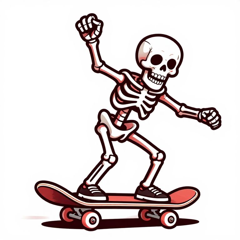 Hook a skeleton skateboarding on a skateboard, in the style of dark white and light red, colorized, bold images, bold outline, toyen, made of all of the above, exaggerated proportions,