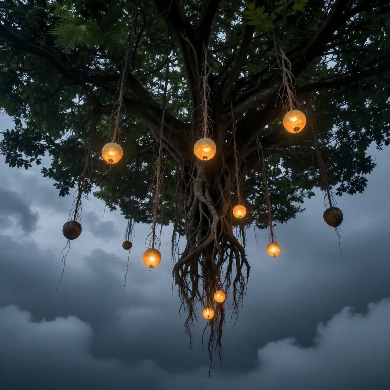 Photograph of a large tree with dense, dark green leaves against a cloudy, dusk sky. Eight glowing orange hanging lights are suspended from the tree's branches and roots, creating a whimsical, ethereal effect. The lights are encased in small, spherical bulbs, each attached to thin, brown cords that dangle from the tree. The tree's roots and lower branches are prominently visible, adding a natural, organic texture to the scene. The overall mood is mystical and serene, with the warm lights contrasting against the cool, blue-gray sky.