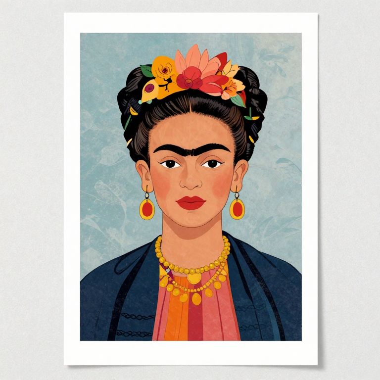 Digital portrait of Frida Kahlo with dark hair in buns, floral crown, red lips, gold jewelry, and blue jacket, against light blue