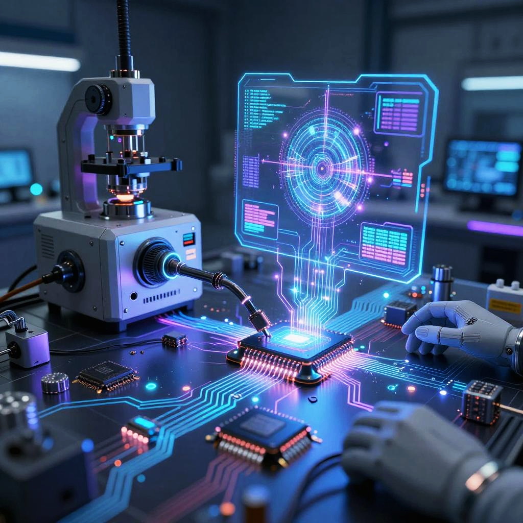 Close-up of an AI sleeve wrapped around a human arm, composed of transparent material revealing embedded microchips and digital veins pulsating light, illuminated by soft blue ambient light within a high-tech laboratory environment.
