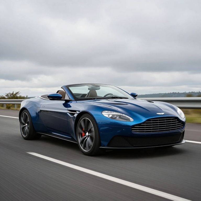 A sleek Aston Martin DBS Volante Convertible, painted in deep blue, speeds along a highway under overcast skies, its driver visible through the open top, showcasing the iconic luxury sports car's dynamic presence.