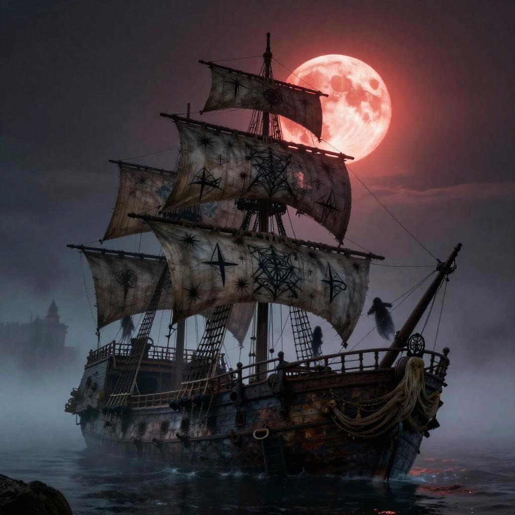 An abandoned gothic pirate galleon enveloped in thick fog, sails shredded and decorated with dark arcane symbols, ghostly figures lurking on the deck beneath a blood-red moon, haunting and surreal maritime gothic style