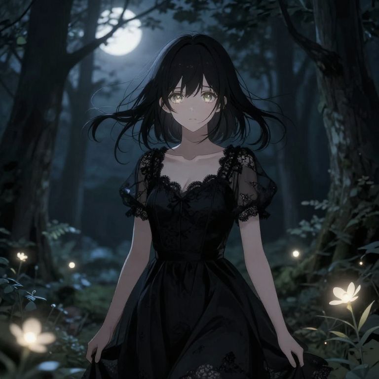 Anime girl in black dress standing in a moonlit forest, delicate lace details on the dress, soft glowing eyes, gentle breeze moving her hair, ethereal and mysterious atmosphere, detailed background with glowing flowers and shadows.