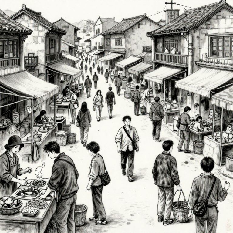 Black-and-white manga-style drawing of a bustling outdoor market with people shopping, vendors selling food, and traditional Japanese buildings in the background.