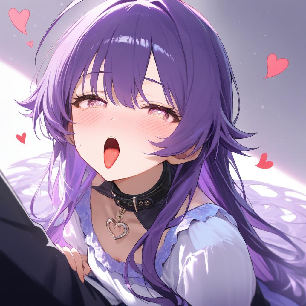 Close-up digital illustration of an anime girl with purple hair wearing butterfly-shaped hairpins and a choker. She has wide purple eyes and is depicted with a slightly open mouth, styled in a detailed and vibrant anime art style with a dark background.