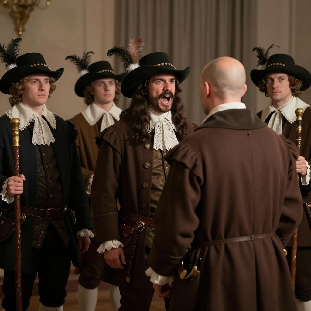 Historical reenactment photograph. Five men in 17th-century clothing, dark hats with feathers, lace collars, and brown coats. One man with a mustache, long dark hair, and intense expression yells at bald man with back to camera. Other men look on, holding staffs. Dimly lit room with curtain background.