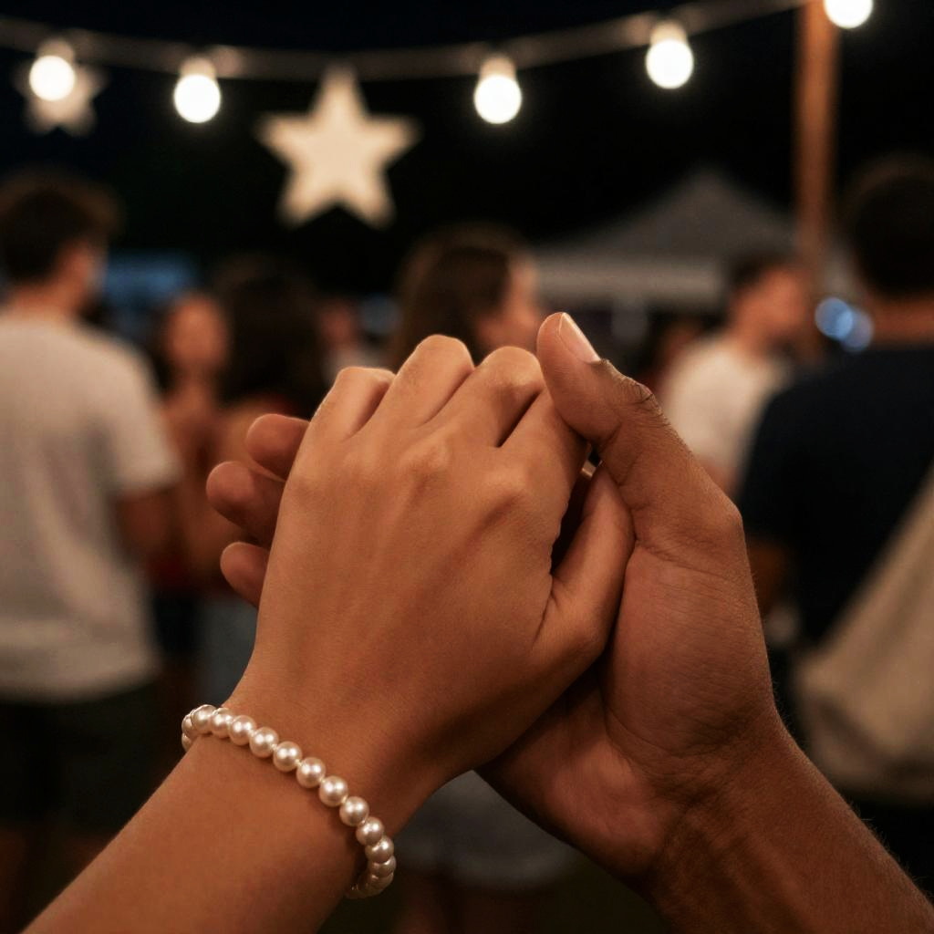 Close-up of two hands holding each other, female wearing pearl bracelet, male's arm visible, blurred crowd in background, warm lighting, string lights, star-shaped decorations, soft focus, intimate moment.