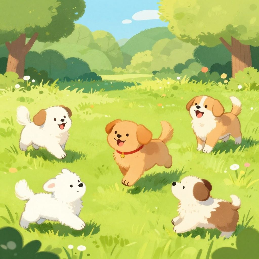 This is a vibrant, digital cartoon illustration of five playful puppies in a sunlit, green meadow. The puppies, of varying shades of brown and white, are joyfully running and playing, each with happy expressions and tongues out. The central puppy, with a golden-brown coat and red collar, stands out. The background features lush, green grass, tall trees with dense foliage, and a bright blue sky. The scene is filled with sunlight and small white flowers, creating a cheerful and lively atmosphere. The style is colorful and whimsical, with smooth, rounded shapes and a playful, animated feel.