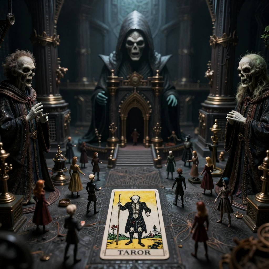 (The Magician from Tarot:1.3), 8k UHD, ultra-high res, ultra detailed, DSLR, best quality, high detailed, greg rutkowski by Simon Bisley, (wide shot, full shot:1.3), , intricate, Tilt-shift, ultrarealistic, Miniature, parallax effect, dark sci-fi fantasy, gothic horror, James Ensor, Unica Zurn, Zdzislaw Beksinki, Metallics, surrealism, disturbing, weird, expression art, meme, Tim burton, grand scale, epic, zoomed out, wide angle.