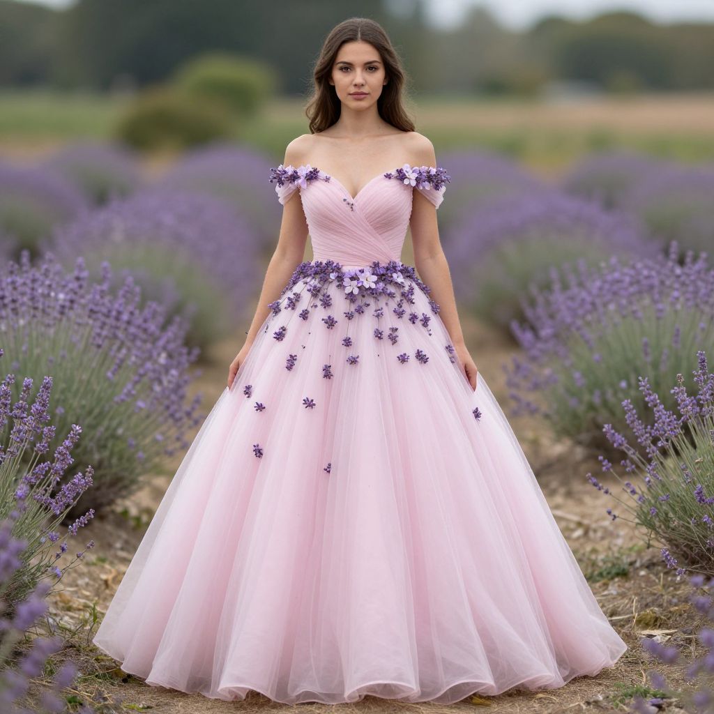 Lavender ball gown, 1girl, dress, solo, brown hair, long hair, flower, breasts, pink dress, off shoulder, full body, bare shoulders, blurry, outdoors, cleavage, looking at viewer, medium breasts, standing