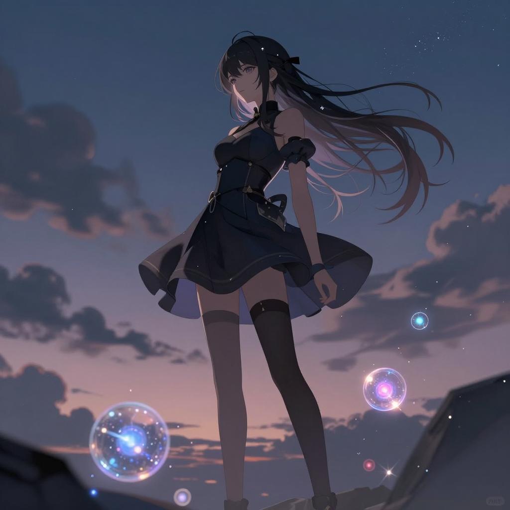 Digital illustration of a futuristic anime-style girl with long flowing hair, wearing a dark dress and thigh-high stockings, standing amidst glowing magical orbs. The background features a twilight sky with clouds and sparkling cosmic elements, creating a mystical and ethereal atmosphere.