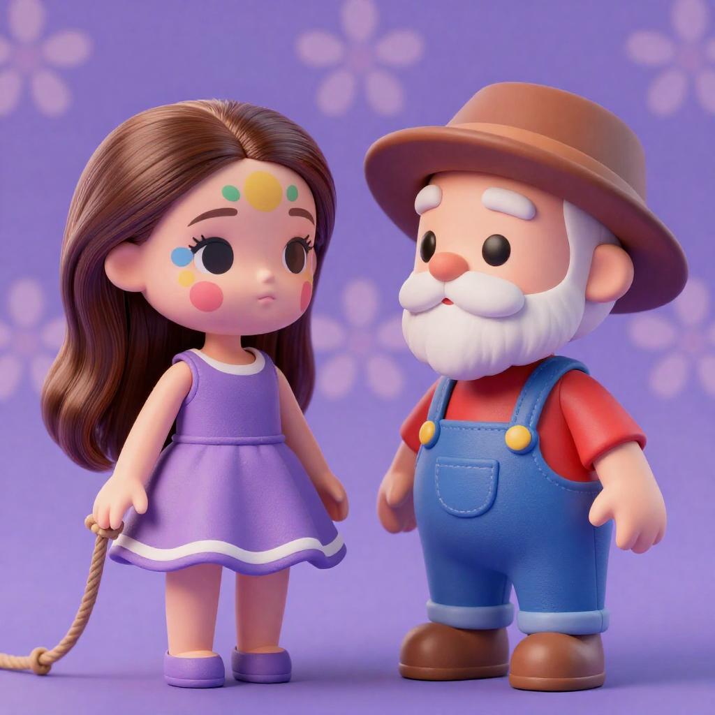 Digital illustration of a doll and a cartoon character. The doll has long brown hair, colorful face paint, purple dress, and rests her hand on a rope. The cartoon character has a white beard, brown hat, red shirt, and blue overalls. They stand facing each other with a purple, flower-patterned background. Both have neutral expressions. The doll's face is slightly turned towards the cartoon character.