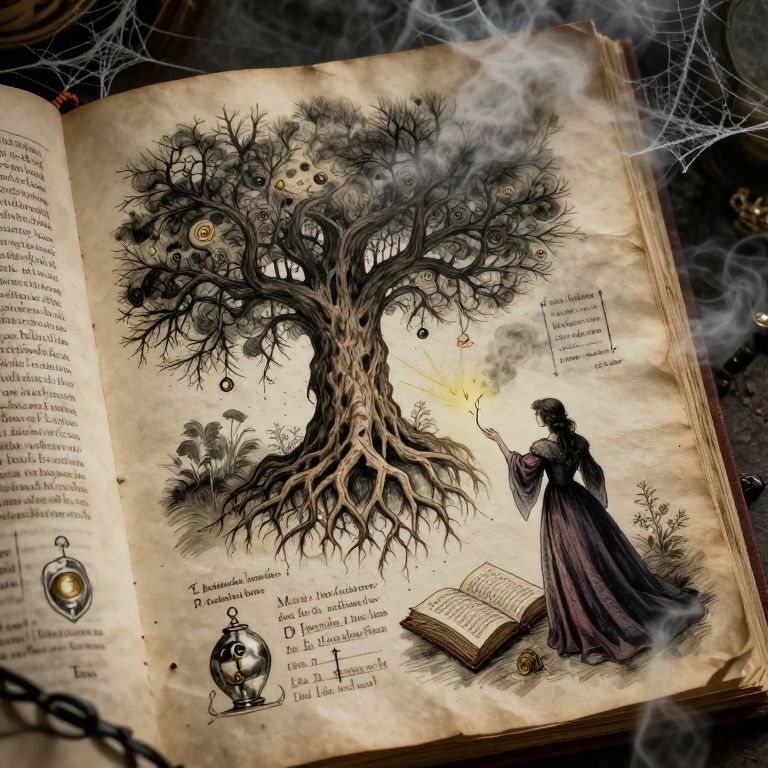 The image depicts a dramatic, cinematic atmosphere filled with smoky, cobwebbed corners and dust particles, evoking a sense of mystery and antiquity. The scene is set on a detailed manuscript page from a witch's grimoire, richly illustrated with pen and ink watercolor drawings. The central focus is a large, intricate tree-like creature with sprawling roots and branches, exuding a sense of otherworldly power. To the right, a figure in a flowing, old-fashioned dress appears to be casting a spell, with a book open in front of them, possibly containing the incantation. The background is filled with swirling smoke and cobwebs, adding to the eerie ambiance. The page is adorned with handwritten notes and diagrams, detailing spells and resurrection techniques using various metals such as Gold, Mercury, Phosphorus, Lead, Magnesium, and Tin. The overall composition is complex, with elements arranged in a balanced yet dynamic manner, creating a sense of depth and intrigue.
