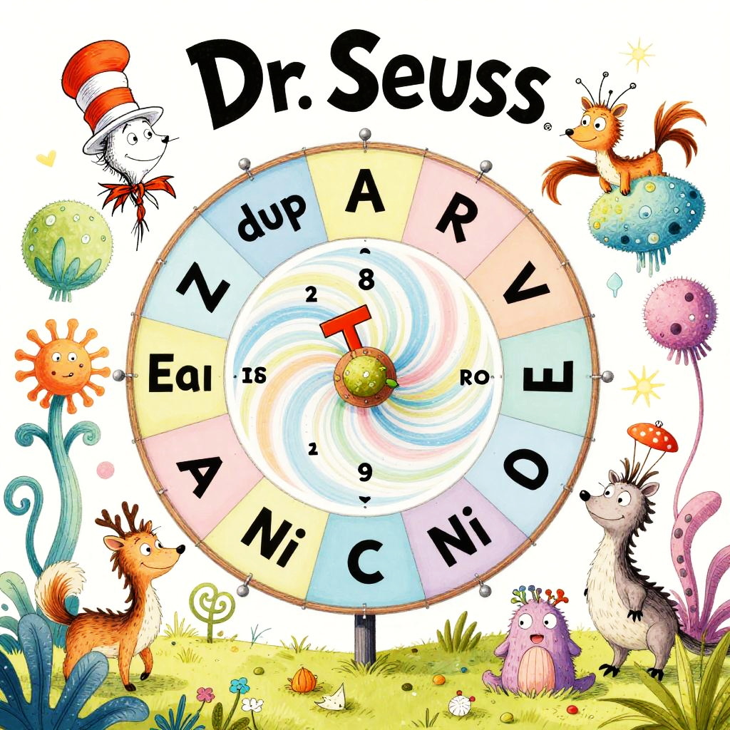 Dr Seuss name generator concept, fantastical landscape with quirky animals and odd-shaped plants, abstract patterns blending into a swirling name wheel, bright pastel colors, children’s book illustration style, lively and creative mood