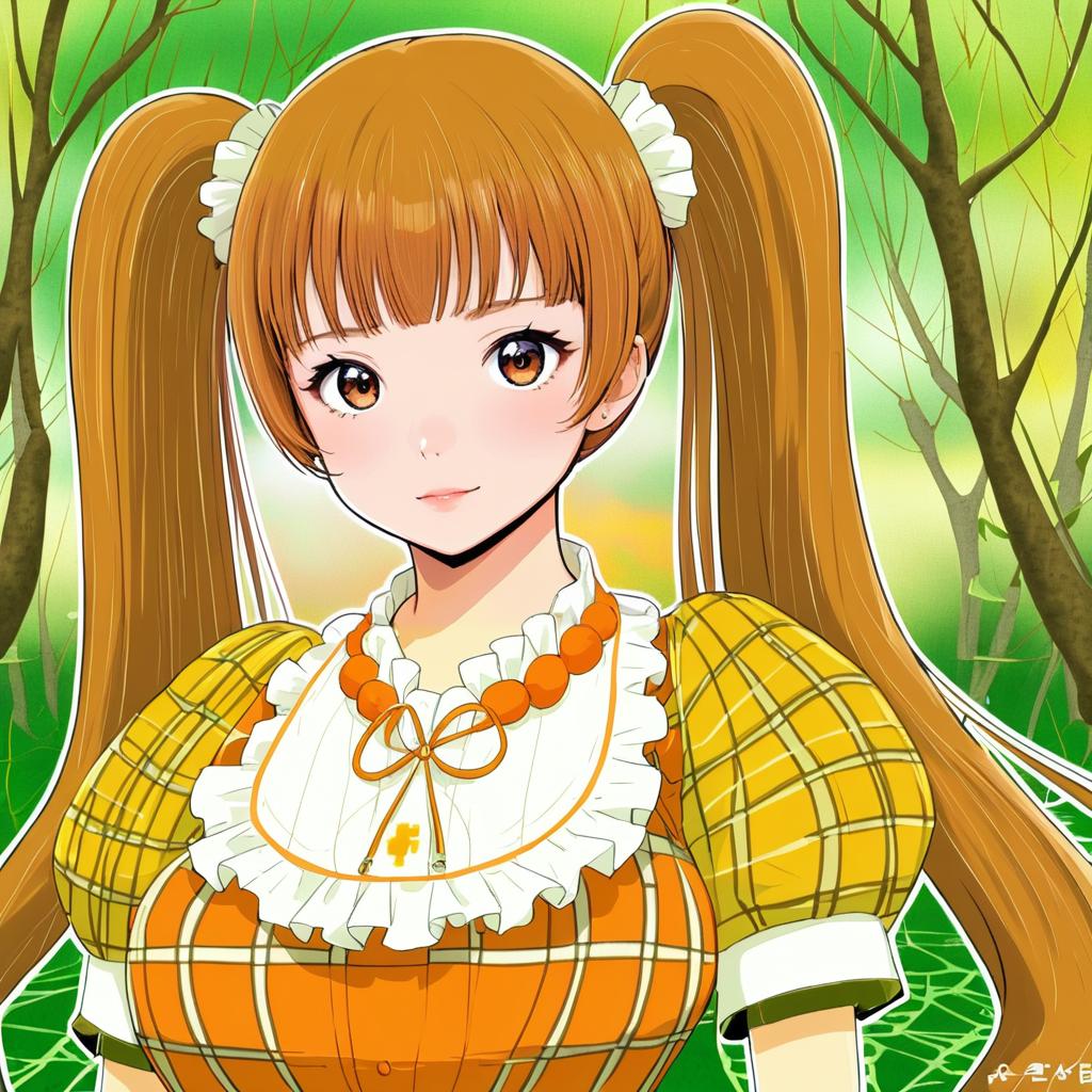 Anime-style illustration of a young girl with long orange twintails and large brown eyes. She has pale skin and a slightly blushing face. The character wears a traditional-inspired outfit featuring a cream-colored top with green lines, orange trim, and red checkered sleeves. The style is detailed and vibrant, capturing a soft and innocent expression.