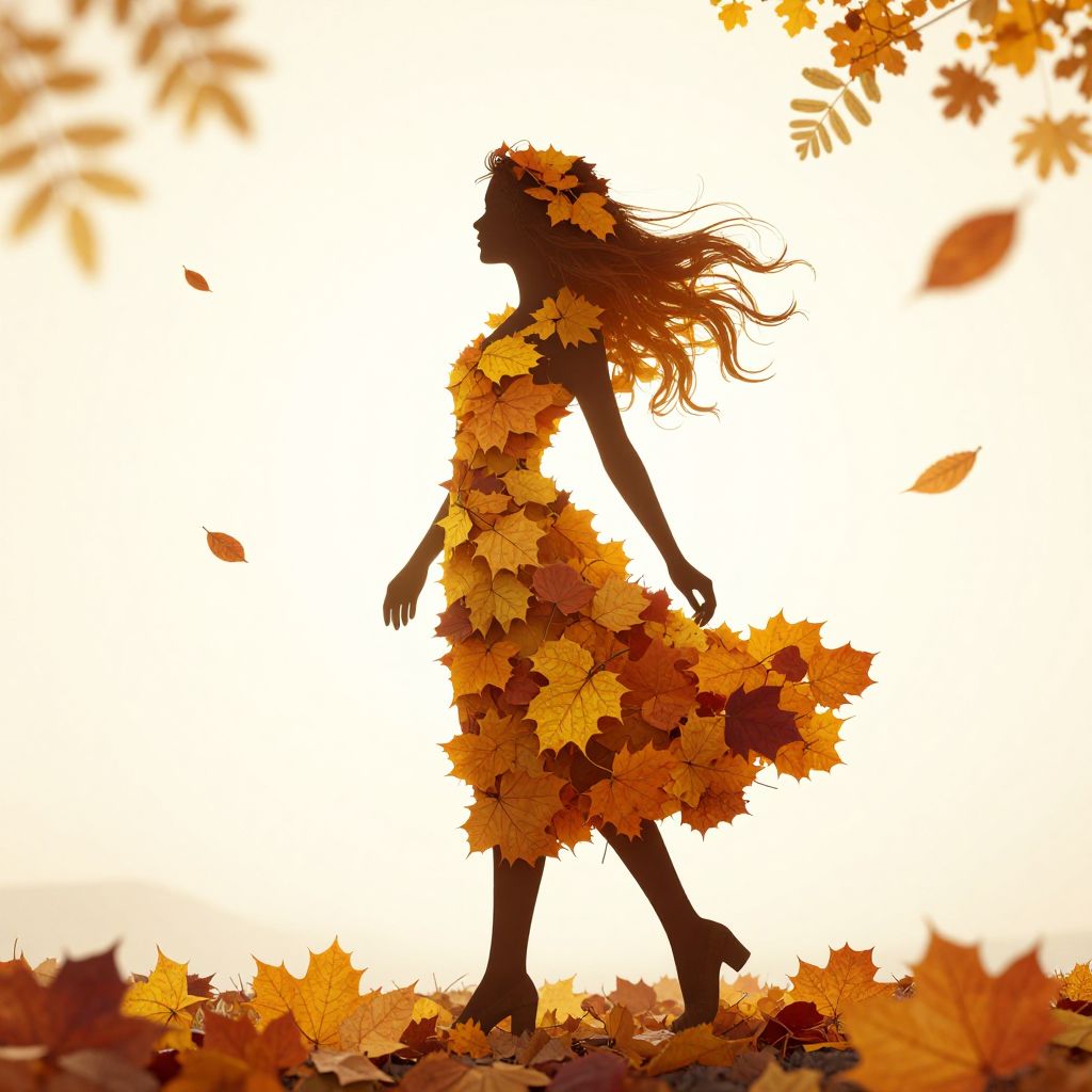 Digital illustration of a silhouette of a woman with long, flowing hair, wearing a dress made entirely of autumn leaves in shades of orange, yellow, and red. She is walking through a forest, with leaves falling around her. The background is a bright, white sky, contrasting with the rich, warm colors of the leaves. The woman's profile is in profile view, facing right. The image has a soft, ethereal quality, with the leaves creating a textured, layered look against her smooth silhouette.